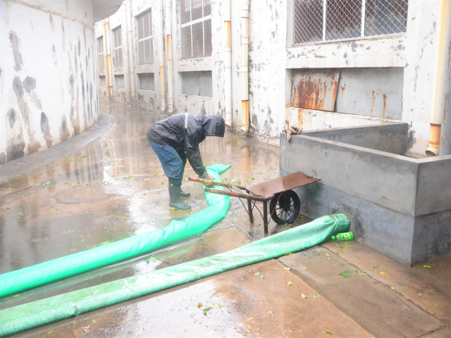 8月10日,臺(tái)風(fēng)帶來的強(qiáng)降水洶洶而至。公司黨委書記、董事長(zhǎng)王力民到公司各處巡查督導(dǎo),防汛應(yīng)急小組成員各就各位,各部門按職能分工,全力以赴投入到鏖戰(zhàn)“利奇馬”這場(chǎng)硬仗當(dāng)中。為了防止雨水進(jìn)入生產(chǎn)車間,各車間在提前安裝好防水擋板、壘砌防汛沙袋基礎(chǔ)上,每個(gè)出入口都安排專人看護(hù),對(duì)出現(xiàn)漏水、漏電等情況及時(shí)采取措施。在生產(chǎn)現(xiàn)場(chǎng),相關(guān)設(shè)備人員及時(shí)檢查電源柜、防汛泵等設(shè)備,保障正常運(yùn)行;提前增加的安全照明裝置,有效增強(qiáng)了臺(tái)風(fēng)期間的現(xiàn)場(chǎng)亮度。針對(duì)室外積水積水較深這一情況,開啟防汛泵,將積水排入雨水管道,對(duì)積水超過100㎜后安插警示標(biāo)識(shí),并且擺放防汛凳,保障員工安全出入;對(duì)外圍排水口及下水管道及時(shí)沖洗、清理,以避免廠區(qū)積水影響到生產(chǎn)運(yùn)行。