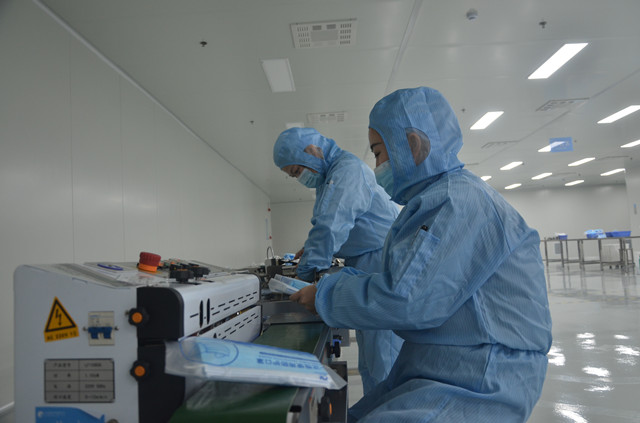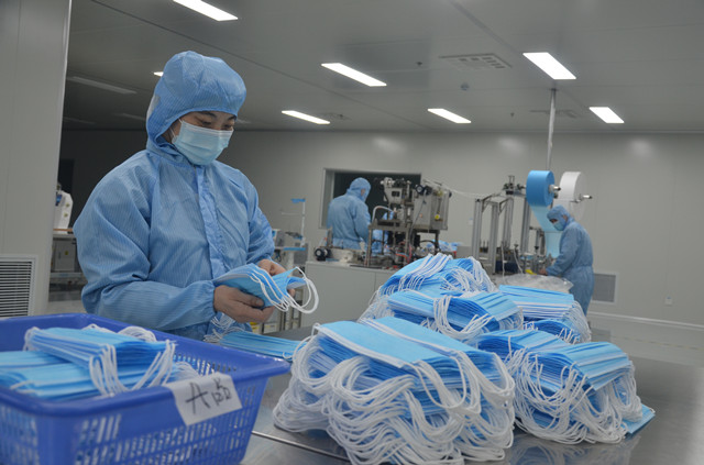 圖為公司清潔車間員工生產(chǎn)口罩的情形。