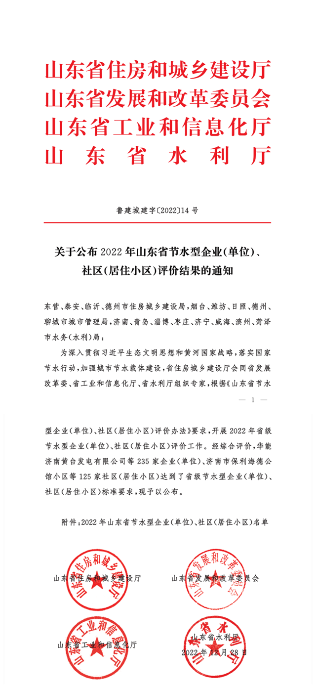 近日,山東省住房和城鄉(xiāng)建設(shè)廳會(huì)同山東省發(fā)展和改革委員會(huì)、山東省工業(yè)和信息化廳、山東省水利廳發(fā)布了《關(guān)于公布2022年山東省節(jié)水型企業(yè)(單位)、社區(qū)(居住小區(qū))評(píng)價(jià)結(jié)果的通知。經(jīng)綜合評(píng)價(jià),公司達(dá)到了省級(jí)節(jié)水型企業(yè)的標(biāo)準(zhǔn)要求,獲評(píng)山東省節(jié)水型企業(yè)。
